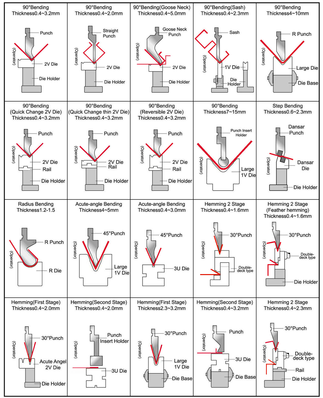 Tabla de referencia de combinaciones de herramientas de conformado y doblado