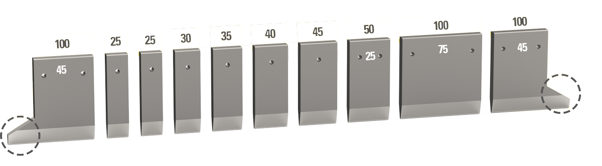 ✔ Soportes para cuchillas: 100 (cuerno izquierdo) 25, 25, 30, 35, 40, 45, 50, 100, 100 (cuerno derecho) = 550 mm(colocar)